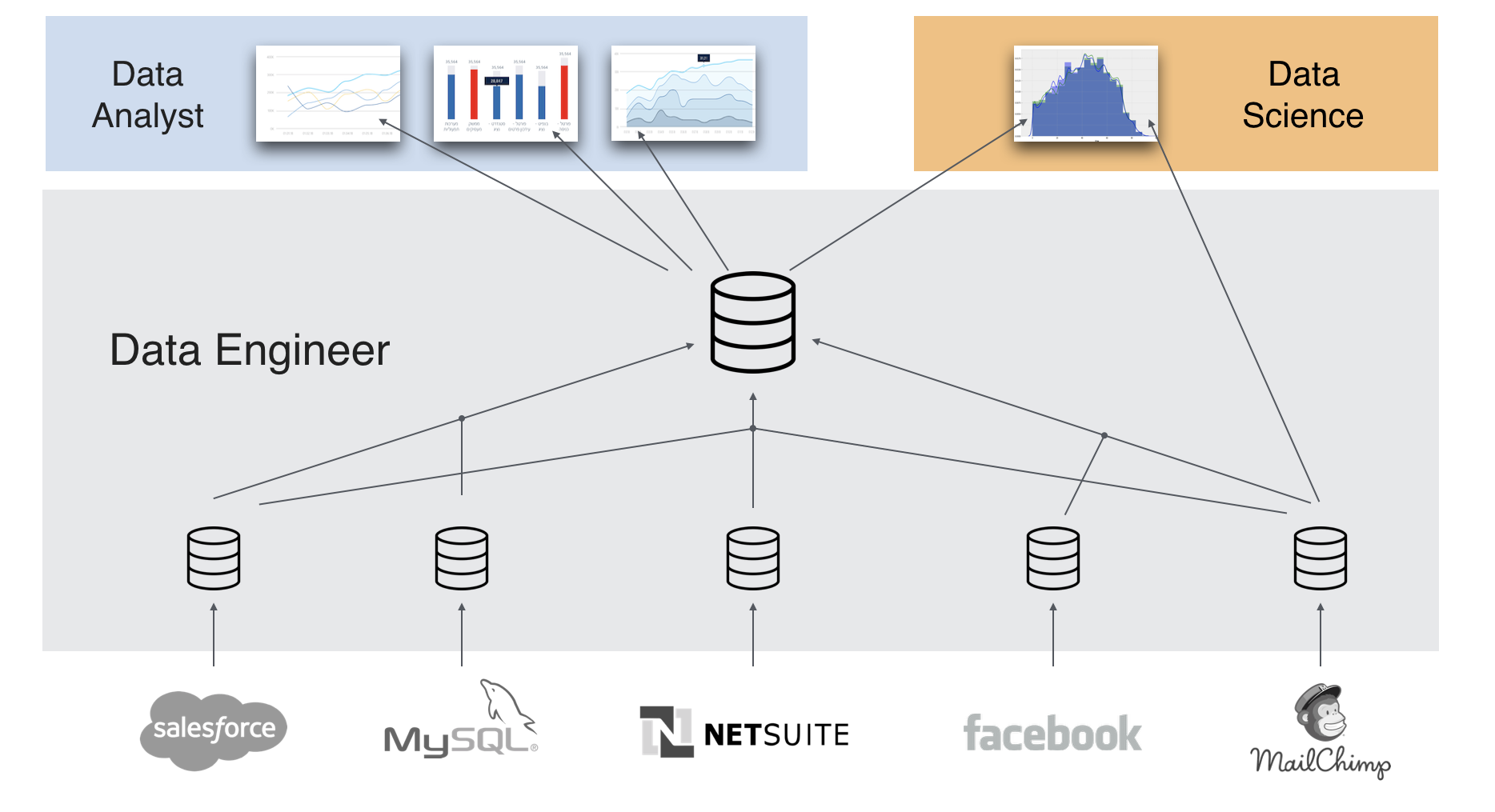 תפקידו של data engineer הוא לדעת להתחבר למקורות נתונים שונים, כגון בסיסי נתונים, קבצים, API. למשוך אותם בצורה נכונה ויעילה, למשל למשוך רק שינויים, להכיר את מבנה הנתונים במקור ולבסוף לדעת איך לחבר את הנתונים עם מודל הנתונים הקיים. יש כאן data modeling המותאם לצרכי התחקור העיסקי, אינטגרציה של נתונים בגרנולריות שונה, הבנה של מפתחות וקשרים בין data sets ועוד המון תחומים טכניים כאלה ואחרים הקשורים בדאטה. ה data engineer עובד עם בסיסי נתונים ועם כלי אינטגרציה (ELT). ישנן תחומים בהם יש צורך גם בטכנולוגיות משלימות כמו פייתון, ספארק וכד', אבל לרוב השאיפה להשאר בשפת SQL סטנדרטית.