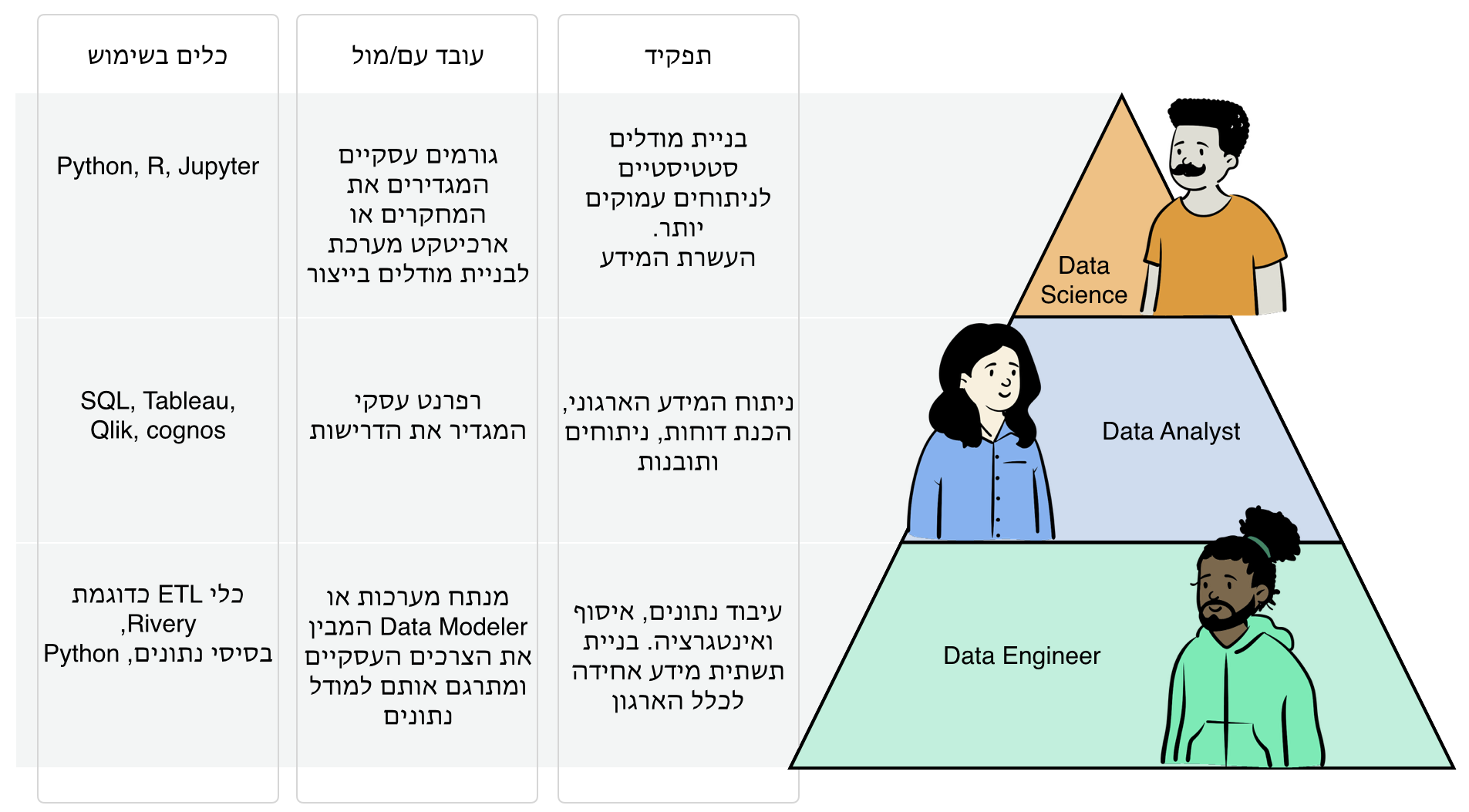 אם כך בעולמנו יש שלושה תפקידים מרכזיים: data engineer, data analyst ו- data science. קיימים מסביב עוד מספר תפקידים כמו מנתח מערכות, רפרנט עסקי וכד', אבל אנחנו נתמקד ב hands-on וסביבם נבנה את האחרים.