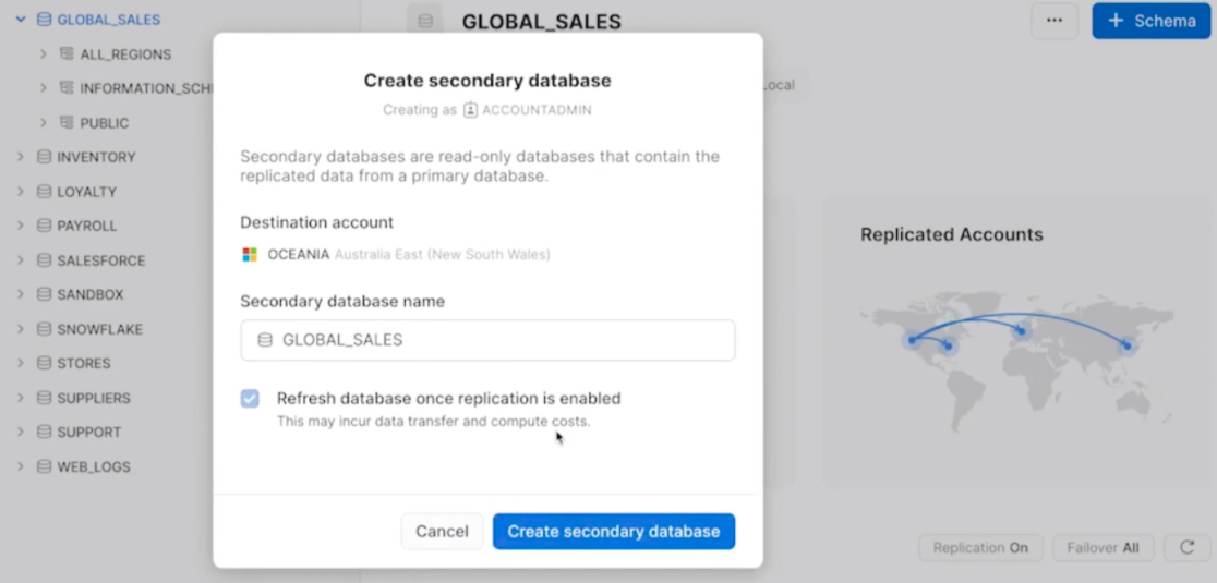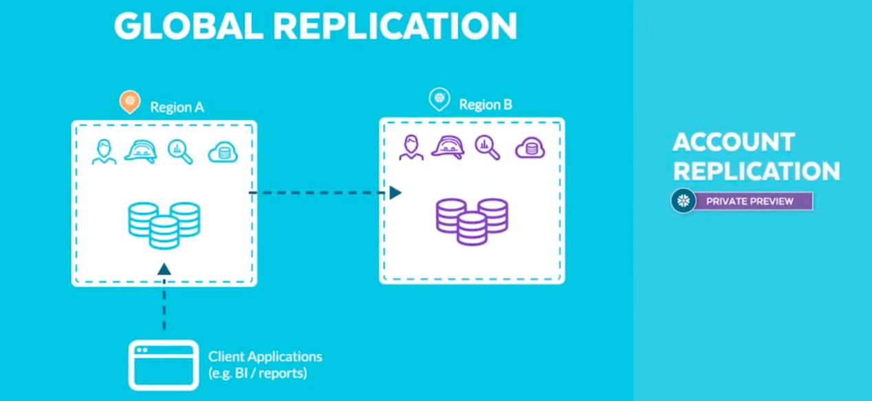 - Account Replicationׁ - עד כה כאשר ארגון היה רוצה לעבור בין עננים, היתה יכולת מובנית להעביר את ה-Data באמצעות ה-Data Sharing אך הלקוח היה צריך להעביר את כל הישויות הגלוביות כגון משתמשים, הרשאות וכד׳. סנופלייק מכריזה כל רפליקציה מלאה בין חשבונות (Private Preview) שתאפשר ללקוחות להעביר את כל האופרציה (Account) בקליק. אם תרצו, ניתן לקרוא לזה מהפיכת הניוד בסלולר, בקליק אחד לקוחות יוכלו להעביר הכל מ- Azure ל- AWS ולהיפך, כמו גם מעבר איזור בתוך אותו ענן למשל, מאירופה לישראל לכשיוקם ה-Region.