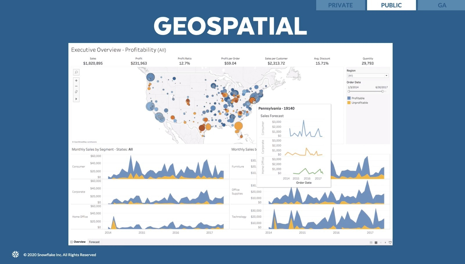 נוסף Data type חדש המאפשר לשמור מידע גיאוגפי. בתמונה הנ״ל מופיע צילום מסך מהגרסה הבאה של טאבלו שהוסיפו את התמיכה ב-Data type החדש. כך שיהיה ניתן להריץ אנליטיקה על מידע גיאוגרפי כגון מרחקים, שטחים, Path וכו׳. חשוב מאד.