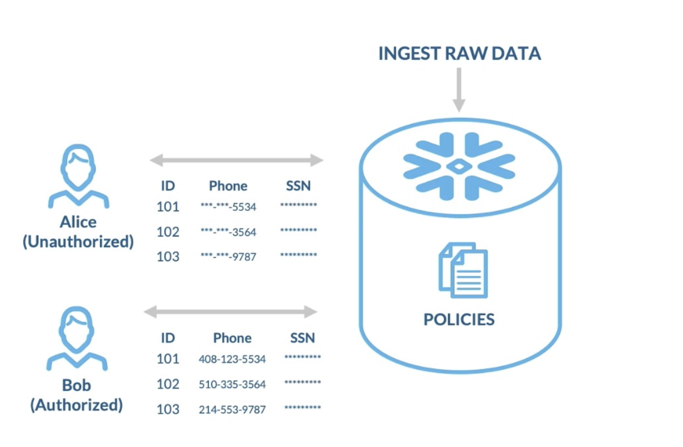 עוד פיצ׳ר קטלני וחשוב, אתם רוצים למסך את המידע לחלק מהמשתמשים? אין בעיה, עם מספר פקודות פשוטות ניתן להגדיר חוקים של Masking לפי Role משתמש וכו׳. כלומר, סנופלייק תומכים כיום בטעינה של מידע פתוח ומיסוך שלו בזמן השליפה, הם לא תומכים בהצפנה בזמן הטעינה. לצורך כך יש כלים צד שלישי כדוגמת SecuPi המאפשרים הצפנה בזמן טעינה ופענוח בזמן השליפה לפי חוקים שונים.