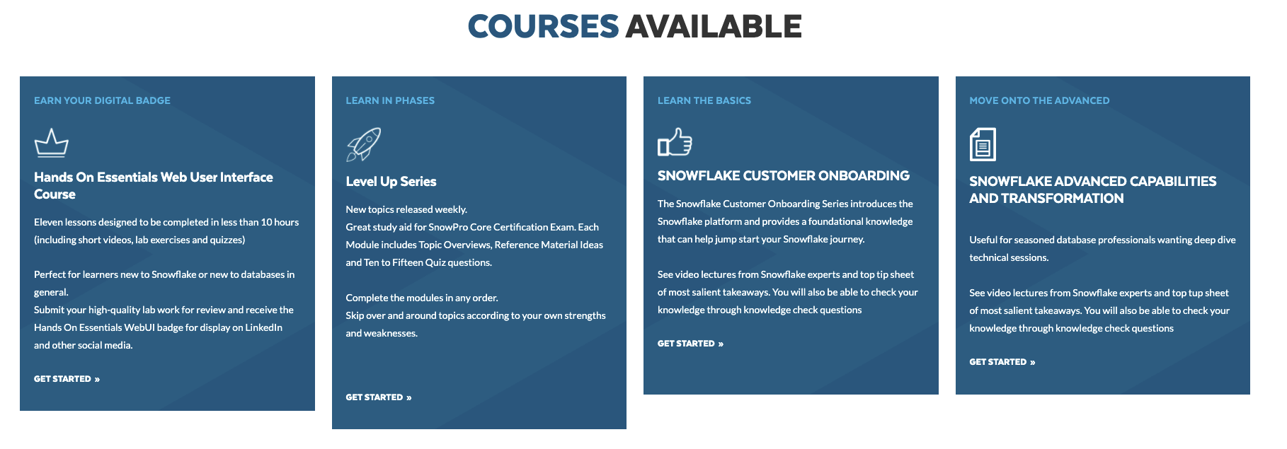 לסנופלייק מערך הדרכה עשיר מאד המשלב סרטוני וידאו (לרוב קצרים) בשילוב עם שאלות בסוף כל שיעור. ניתן להירשם ב-Snowflake University ולהתחיל ללמוד
