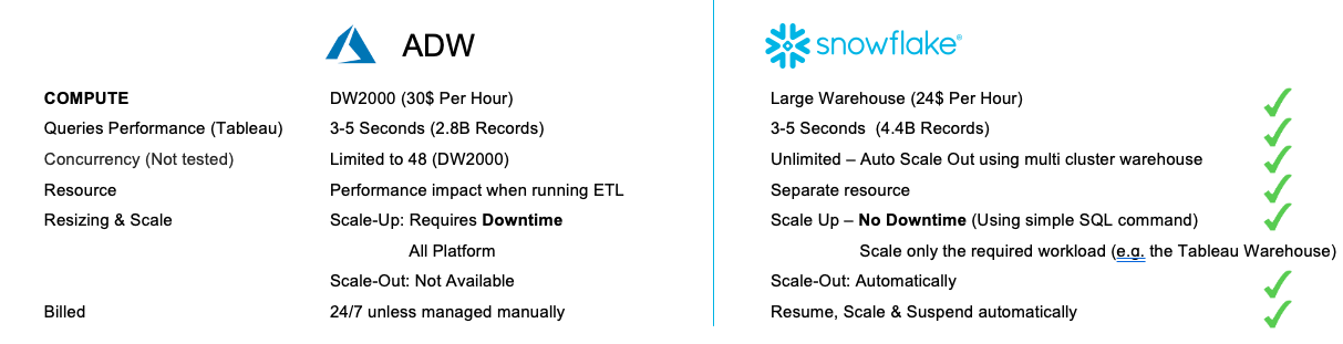 להפתעתנו גילינו שני נתונים שמשנים הכל. ראשית ה-ADW רץ על שרת DW3000! שירות שעולה $45 לשעה. לא ברור מתי השתנה אבל מן הסתם לא רלוונטי לבחון שרת שעולה 32 אלף דולר לחודש. בסנופלייק לעומת זו נבחר שירות Large שעולה $24 לשעה. מיותר לציין שבסנופלייק משלמים רק על זמן שימוש, על כן מדובר בעלות של 6-8 שעות ביום, רק בימי עבודה, כלומר הערכה גסה $3,600 דולר לחודש לעומת 32 אלף... לא בדיוק השוואה רלוונטית.