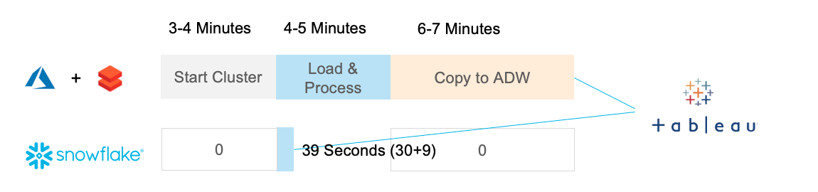 ואכן כשבוחנים תהליך Pipeline מקצה לקצה הפערים בארכיטקטורת הדאטה מתגלים. פתרון אחד בו המידע עובר בדאטה לייק ורק אז מגיע ל-Dwh, לעומת פתרון שני בו כל המידע מעובד ומתוחקר באותה סביבה. והפערים גדולים מאד. מצד אחד העתקת מידע ל-ABS, עיבוד והעתקה ל-ADW. הלקוח העיד שמדובר בתהליך של 12-13 דקות(!) לא כולל עליית הקלאסטר של Databricks. בסנופלייק לעומת זאת תהליך הטעינה והעיבוד ארכו 39 שניות (!) וכמובן אין צורך בהעתקת המידע לבסיס נתונים אחר.