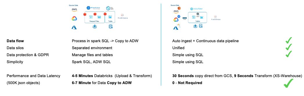 בסנופלייק לעומת זאת הרבה מזה לא נדרש מכיוון שאין חשש לטעון נתוני Raw Data וכן, לסנופלייק יכולות מעולות להתמודדות עם Json-ים וכל סוגי המידע המובנים למחצה (פרקט, אברו וכו׳). אפילו מידע המגיע מ-Stream, עובר אינדוקס ל-Micro partitions אוטומטית וזמין מיידית לתחקור ועיבוד. בנוסף, בסיום העיבוד המידע זמין מיידית בטאבלו, שכן אין צורך להעתיק לפתרון נוסף (בסיס נתונים אנליטי).
